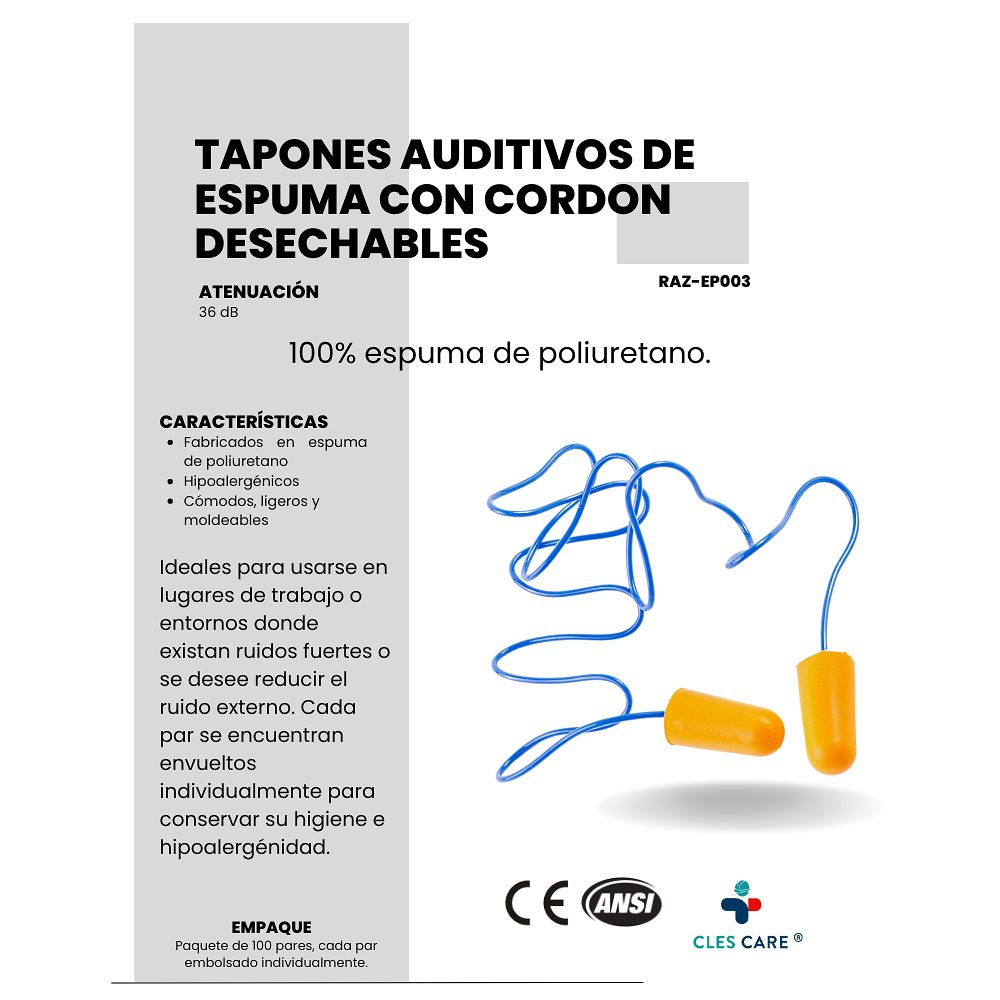 Tapones Auditivos de Espuma Desechables con Cordón | 300 Pares